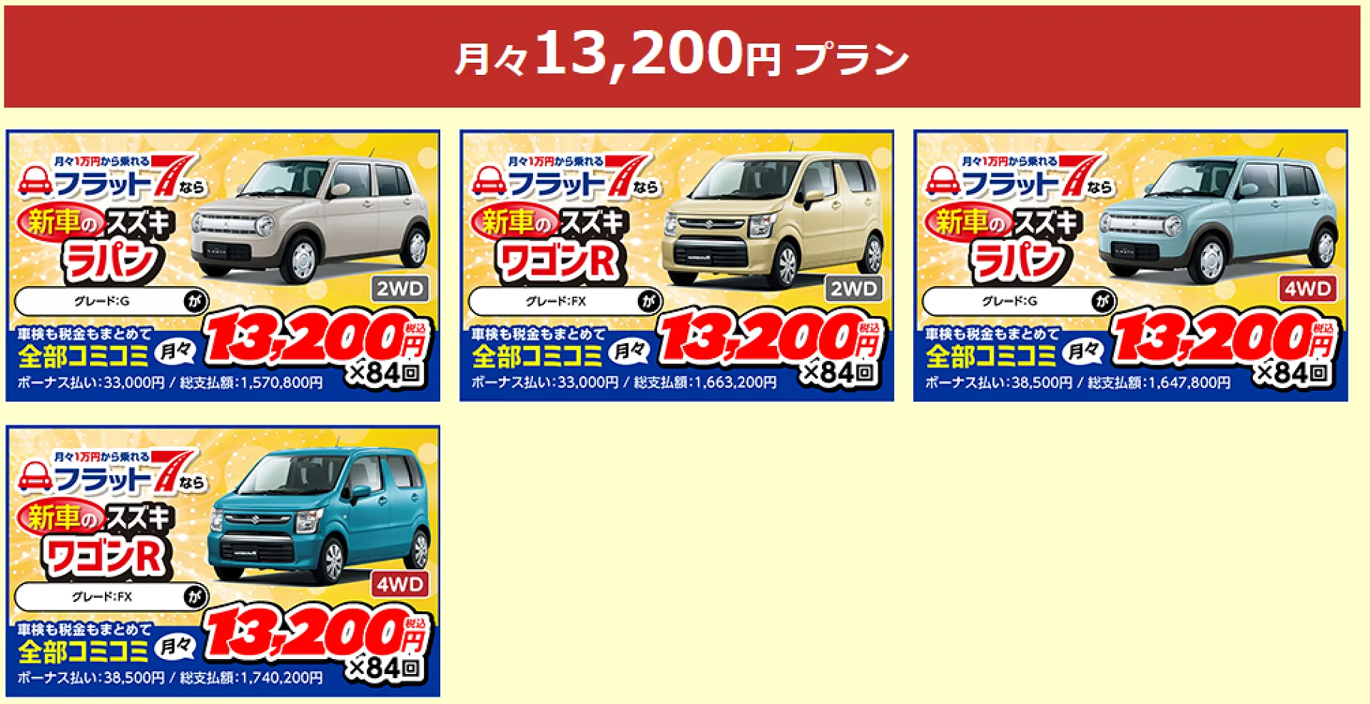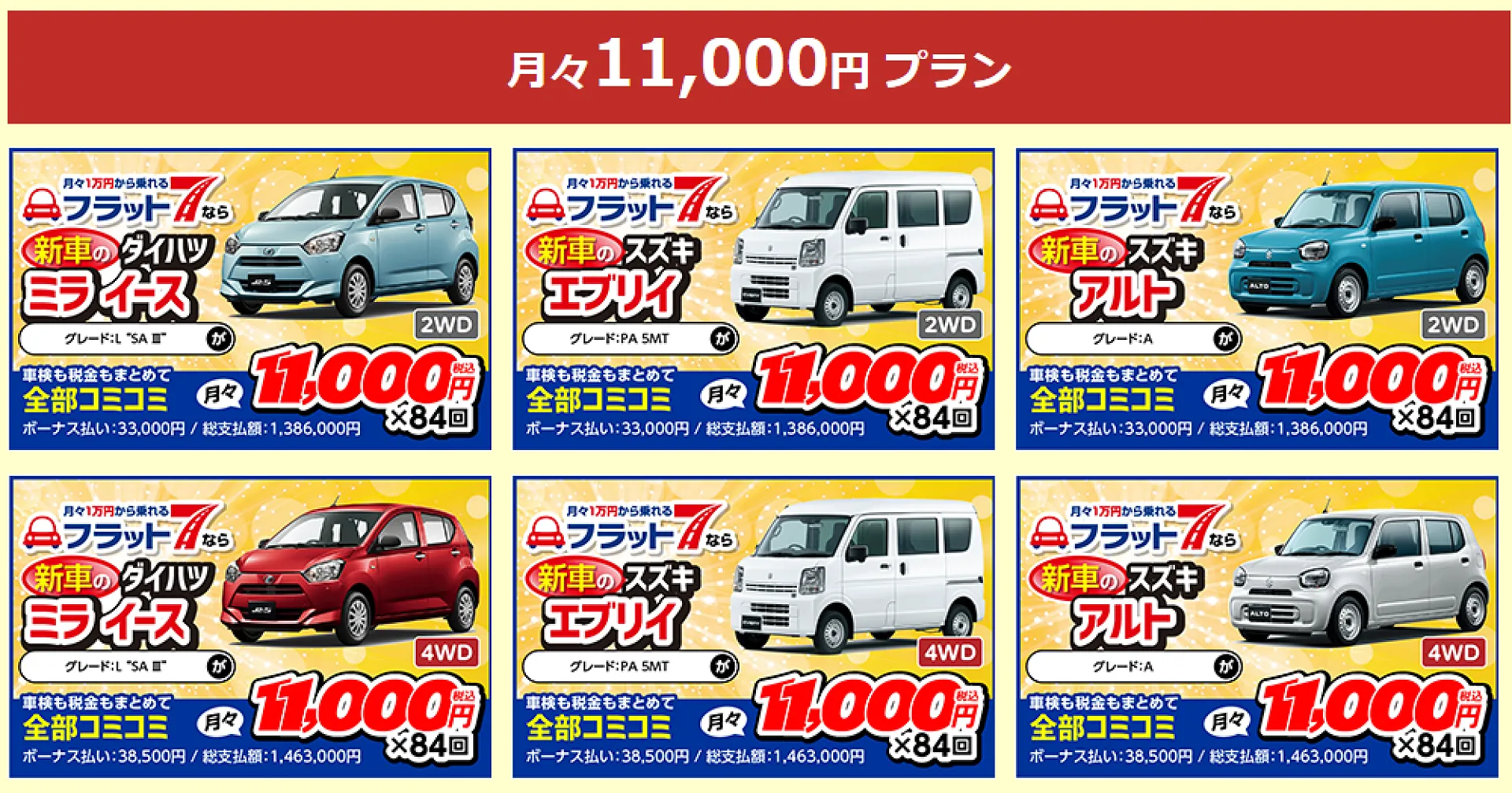 7年間ずっと、月々1.1万円~の低価格で新車に乗ることが可能!ローンと違ってまとまったお金も不要で、車にかかる維持費もコミコミなのでお得にカーライフをお楽しみいただけます。